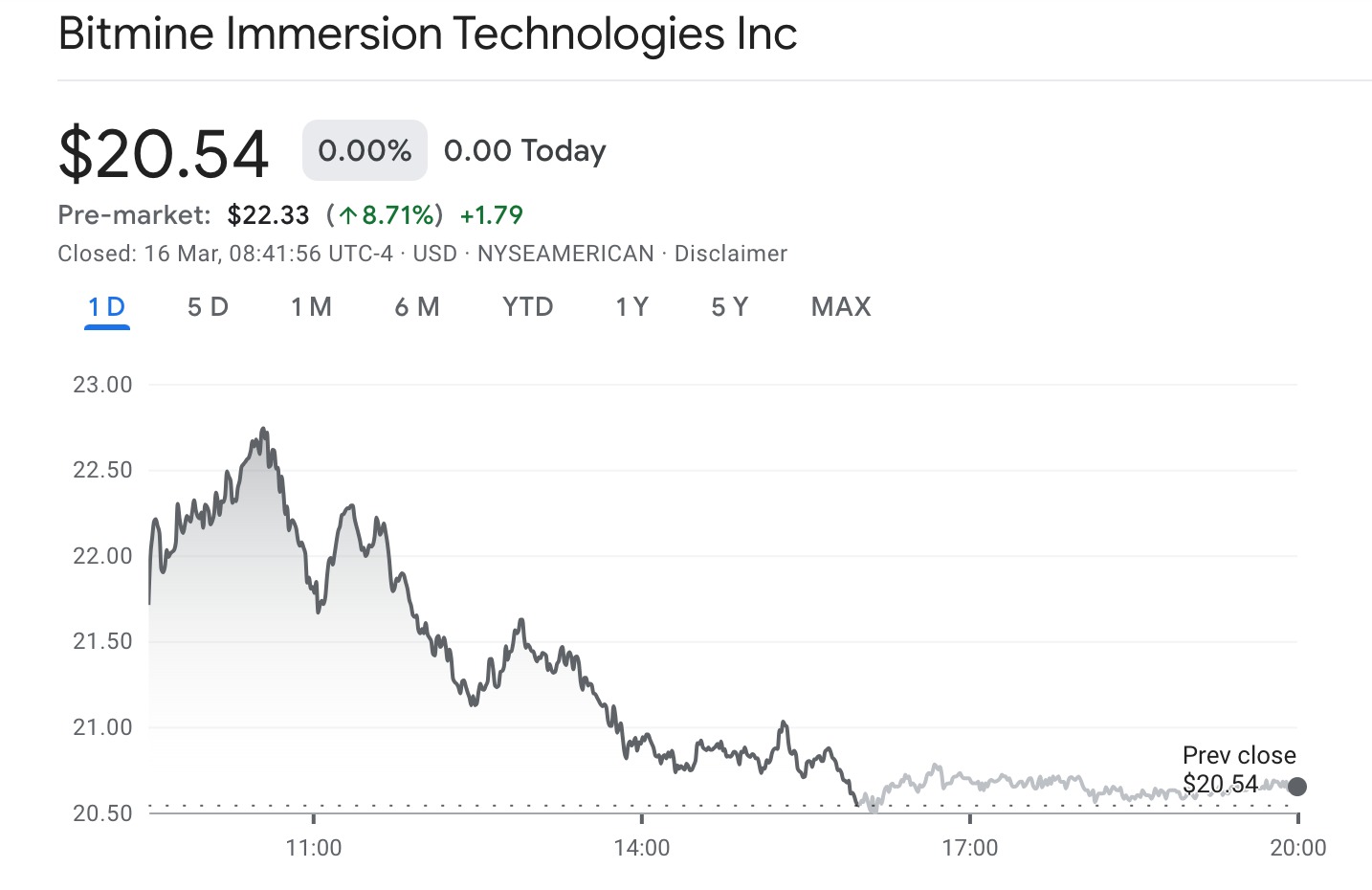 At press time, BMNR inventory traded at $22.37. That is an 8.91% improve, or $1.83 greater at present. BMNR inventory additionally climbed about 6.45% over the previous 5 days. The earlier closing worth is at $20.54.