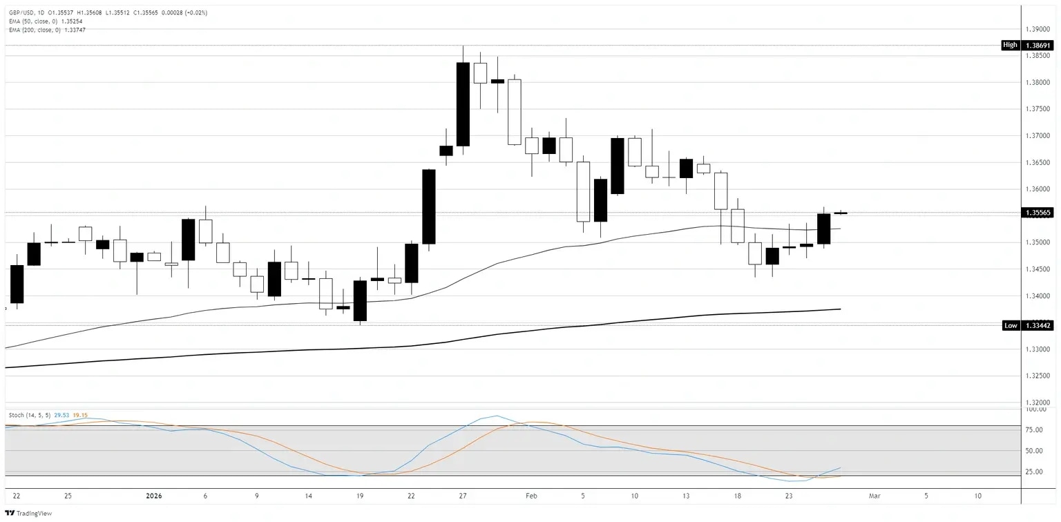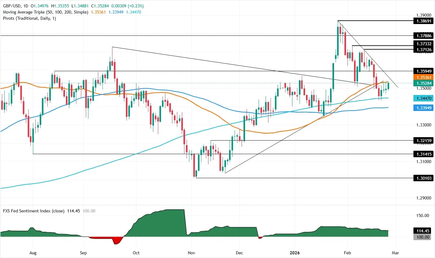 GBP/USD rose 0.42% on Wednesday, recovering towards 1.3600 in a session formed by softer-than-expected UK inflation knowledge and broad US Greenback weak spot. The pair had been consolidating in a good vary between about 1.3450 and 1.3520 for the previous few days following the sharp pullback from the late-January excessive close to 1.3870, and Wednesday’s transfer pushed value motion again onto the excessive aspect of key transferring averages.