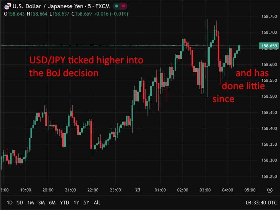 USD/JPY edged modestly larger via the session forward of the BOJ announcement, with restricted conviction. The central financial institution in the end stored its coverage price at 0.75%, however the choice was cut up, with one board member voting for a right away hike to 1.0%. The BOJ revised up a number of inflation projections and improved its development outlook, underscoring a rising inside debate over the tempo of normalisation. USD/JPY noticed solely restricted post-decision volatility, with focus now shifting to Governor Ueda’s press convention (0630 GMT/0130 US Japanese time).