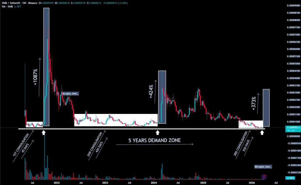 In accordance with the analyst, the token’s value historical past has included a number of prolonged consolidation phases adopted by explosive rallies, together with features exceeding 1000% in earlier cycles. This sample has led some market watchers to counsel that SHIB could as soon as once more be approaching a important accumulation part.