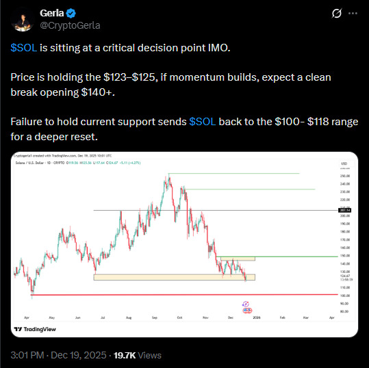 That hesitation is now displaying up on the charts. Analyst Gerla calls this a choice zone. Maintain the $123–$125 vary, and momentum may reopen a push towards $140. Lose it, and SOL dangers a deeper reset into the $100–$118 vary.