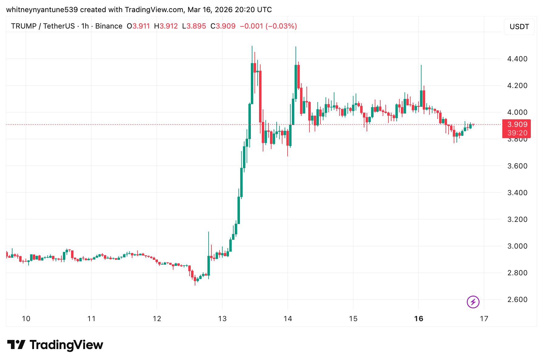 Current whale exercise appeared alongside sharp value actions in TRUMP Coin. The token initially traded round $2.90 to $3.00 earlier than a powerful rally started on March 13. The surge pushed the value close to $4.40 as shopping for stress intensified.