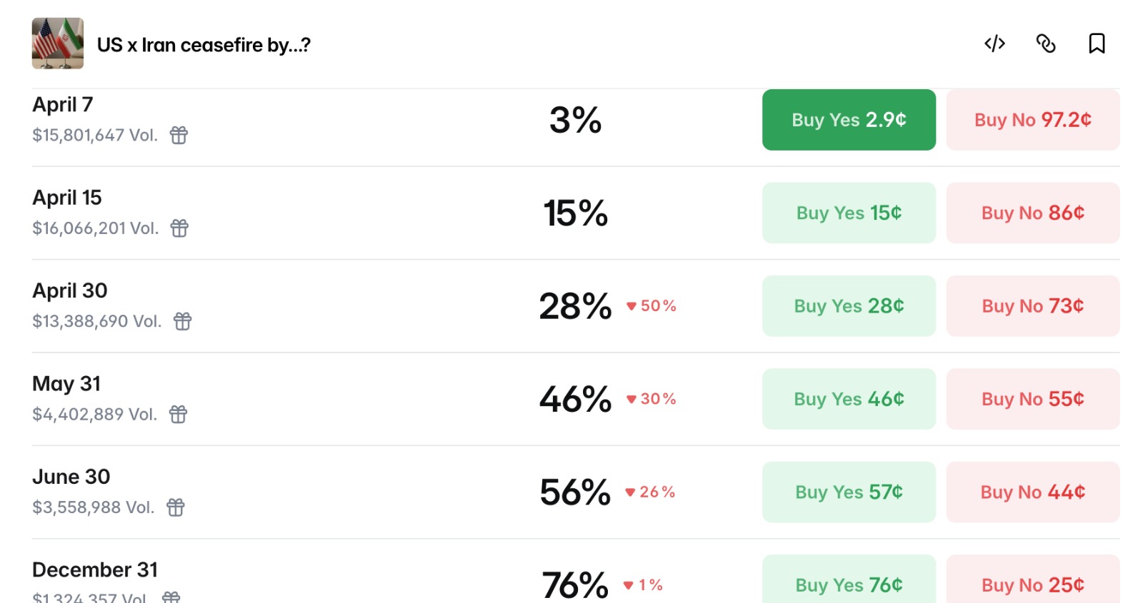 Expectations improve additional over time. The market exhibits 46% odds by Might 31 and 56% by June 30. By December 31, merchants assign a 76% probability of a ceasefire final result.